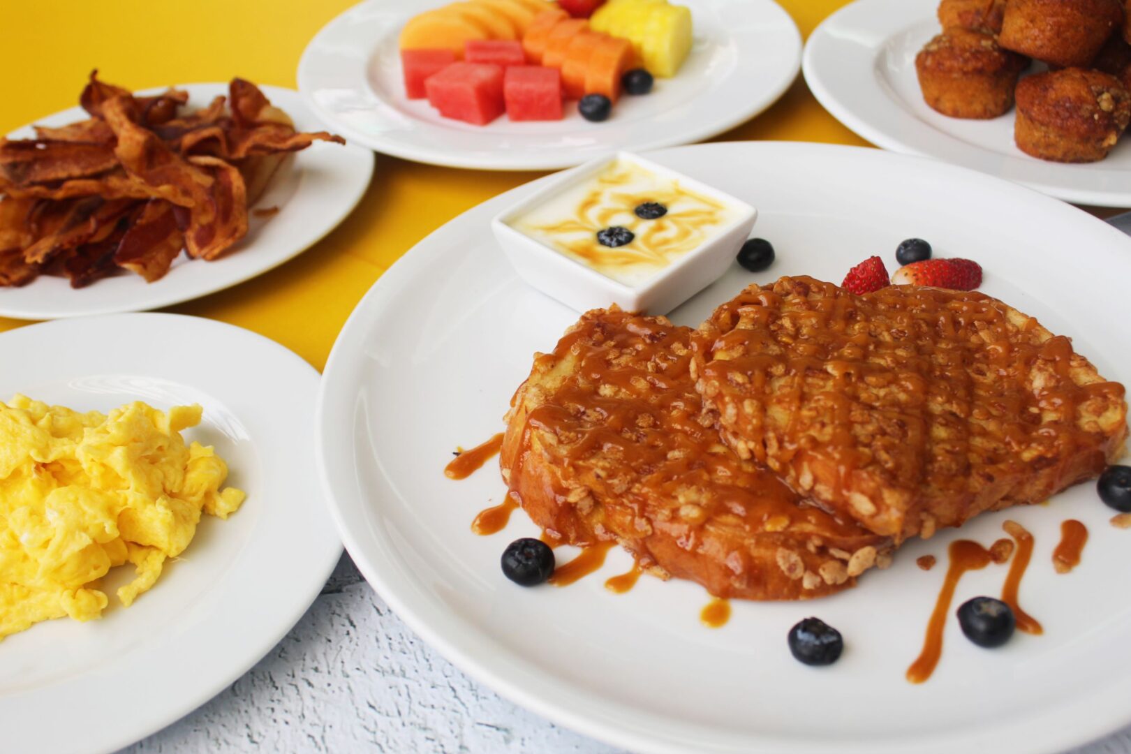 Continuamos con tostadas francesas, un clásico del desayuno que combina a la perfección el dulzor y la textura suave del pan con un toque de canela. Acompañadas de tocino crujiente que agrega un sabor irresistible, este dúo te prepara para un desayuno excepcional.